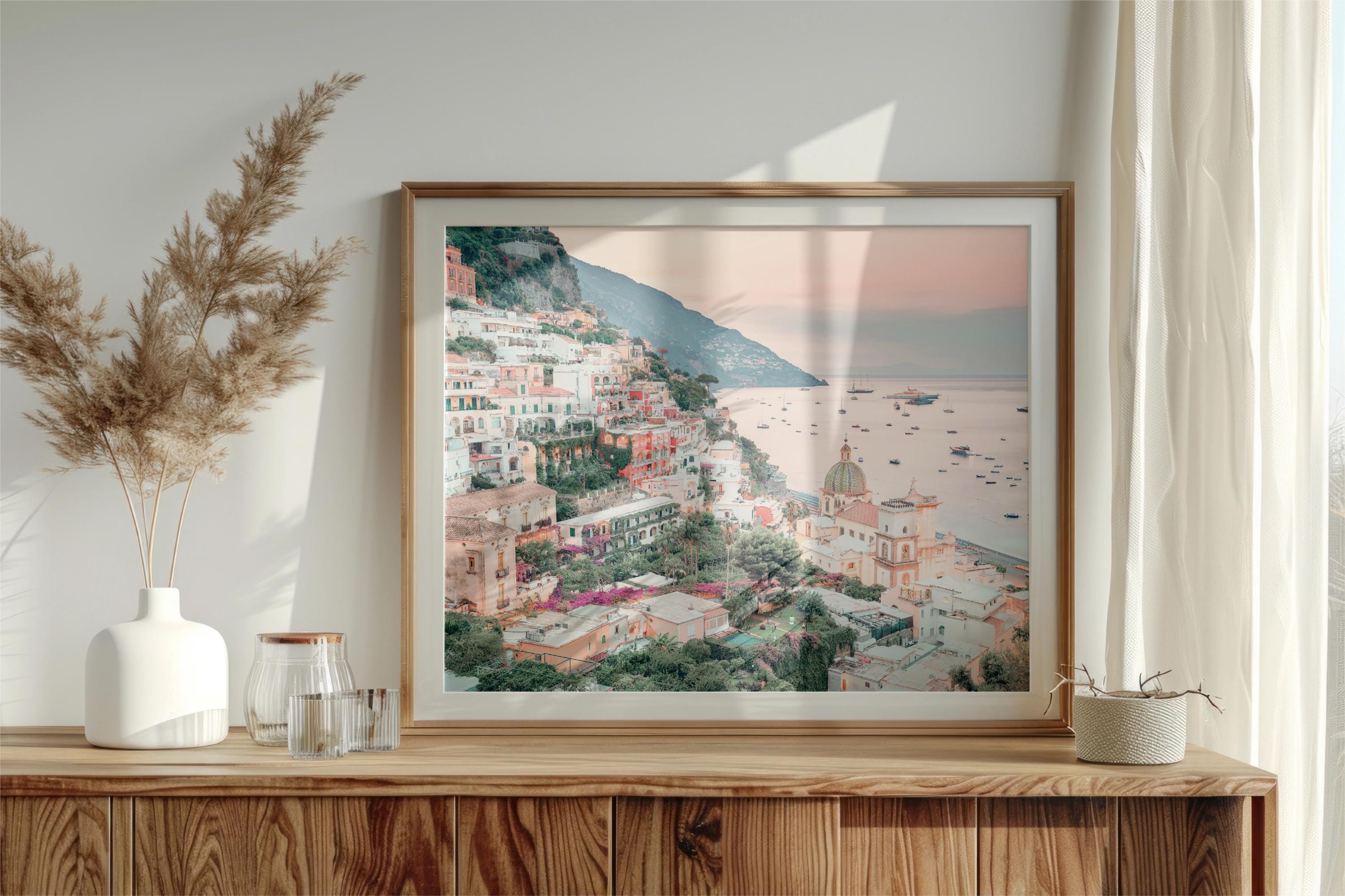 Transform your space with the breathtaking beauty of Italy's Amalfi Coast through this sun-kissed Positano Sunrise wall art print. Captured in dreamy pastel tones, this travel photography print evokes the peaceful elegance of a morning overlooking the Mediterranean, where the day begins with boats gently bobbing and sunlight bathing hillside villas.